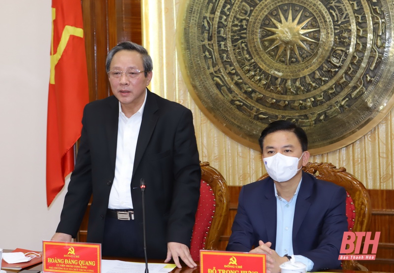 Phát biểu kết luận buổi làm việc, đồng chí Phó Trưởng Ban Tổ chức Trung ương Hoàng Đăng Quang nêu rõ: Thanh Hóa là tỉnh có diện tích, quy mô dân số đông và có số lượng đơn vị hành chính cấp huyện, cấp xã lớn. Rất mừng vừa qua, Thanh Hóa được Bộ Chính trị ban hành Nghị quyết 58 và gần đây Quốc hội đã thông qua Nghị quyết về cơ chế, chính sách đặc thù cho tỉnh. Đó là thể hiện sự quan tâm đặc biệt của Trung ương, của Bộ Chính trị, của Quốc hội và Chính phủ về Thanh Hóa.