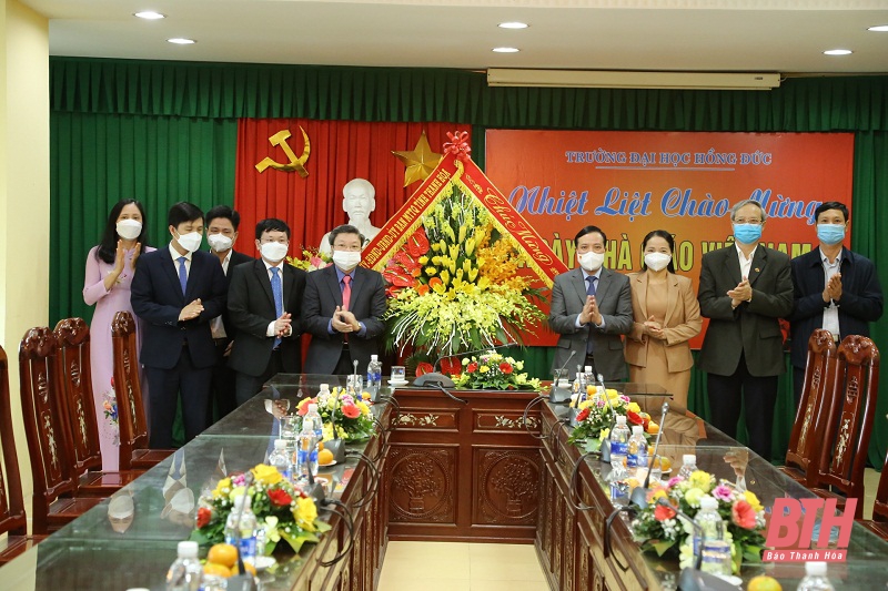 Đồng chí Lại Thế Nguyên, Phó Bí thư Thường trực Tỉnh ủy, Trưởng đoàn ĐBQH tỉnh tặng hoa chúc mừng Trường Đại học Hồng Đức.