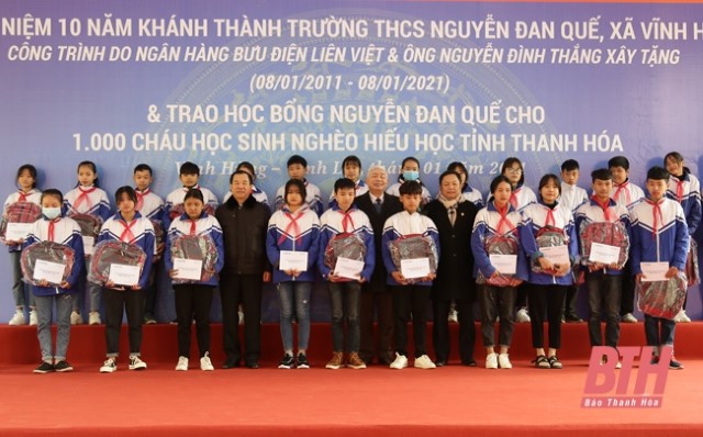 Đại diện lãnh đạo Hội Khuyến học tỉnh và Ngân hàng TMCP Bưu điện Liên Việt trao học bổng Nguyễn Đan Quế cho các em học sinh nghèo hiếu học trên địa bàn huyện Vĩnh Lộc.