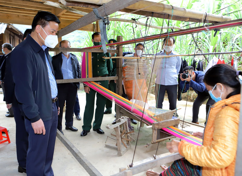 Bí thư Tỉnh ủy Thanh Hóa cùng các thành viên đoàn công tác tham quan mô hình dệt thổ cẩm ở bản Na Hào, xã Mường Chanh, huyện Mường Lát.