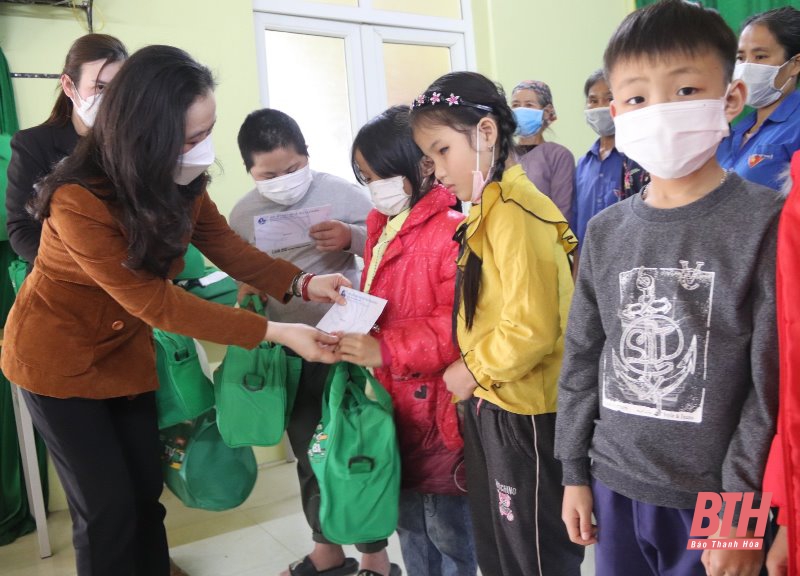 Chủ tịch Hội LHPN tỉnh trao quà cho trẻ em khó khăn huyện Thường Xuân.