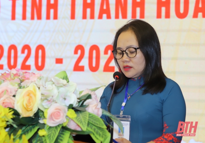 Phó Chủ tịch Ủy ban MTTQ tỉnh Lê Thị Huyền trình bày báo cáo tại hội nghị. (Ảnh: Minh Hiếu)