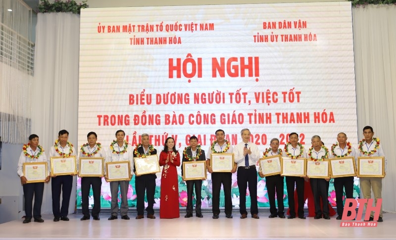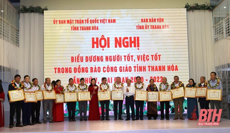 Nhân dịp này, đồng chí Bí thư Tỉnh ủy Đỗ Trọng Hưng và các đồng chí lãnh đạo tỉnh đã trao Bằng khen của Chủ tịch UBND tỉnh Thanh Hóa cho 50 cá nhân; trao Bằng khen của Ủy ban MTTQ tỉnh Thanh Hóa cho 50 cá nhân, đã có thành tích xuất sắc trong tham gia các phong trào thi đua yêu nước, sống tốt đời, đẹp đạo, giai đoạn 2020-2022.