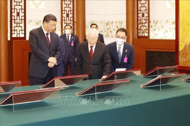 Theo đặc phái viên TTXVN, chiều 31/10, tại Đại Lễ đường Nhân dân ở Thủ đô Bắc Kinh, ngay sau khi kết thúc hội đàm, Tổng Bí thư Ban Chấp hành Trung ương Đảng Cộng sản Việt Nam Nguyễn Phú Trọng và Tổng Bí thư Đảng Cộng sản Trung Quốc, Chủ tịch nước Cộng hòa nhân dân Trung Hoa Tập Cận Bình đã cùng chứng kiến 13 văn kiện đã được các ban, bộ, ngành, trung ương và địa phương ký kết trong chuyến thăm chính thức lần này.