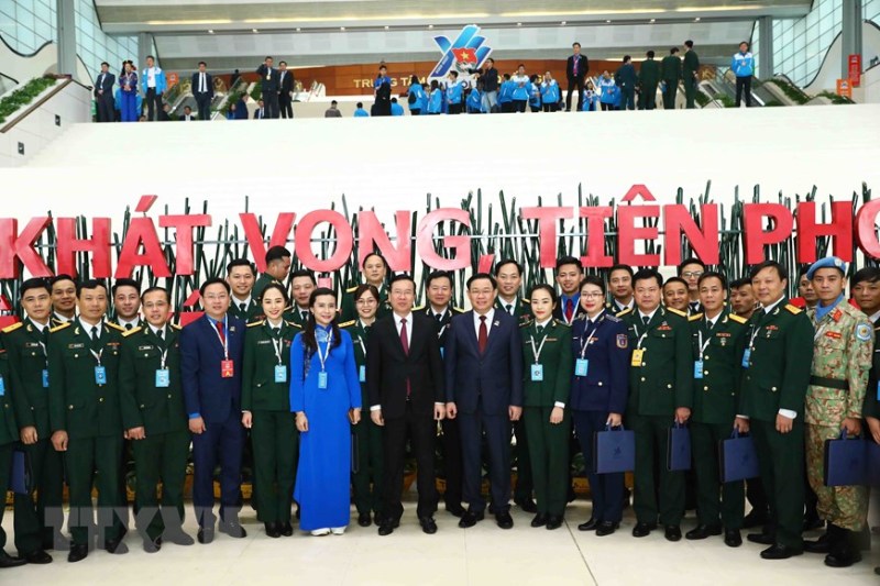 Chủ tịch Quốc hội Vương Đình Huệ, Thường trực Ban Bí thư Võ Văn Thưởng với các đại biểu khối Quân đội tại lễ khai mạc. (Ảnh: Minh Đức/TTXVN)