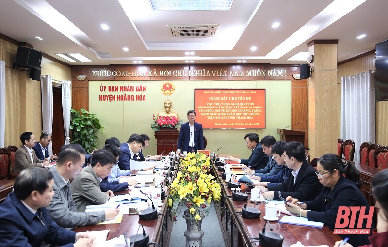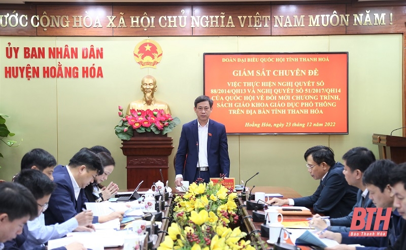 Phát biểu kết luận buổi giám sát, Phó Trưởng Đoàn ĐBQH tỉnh Mai Văn Hải đánh giá cao công tác lãnh đạo, chỉ đạo của cấp ủy, chính quyền, ngành giáo dục huyện Hoằng Hóa trong thực hiện đổi mới nội dung chương trình, SGK GDPT 2018 trong thời gian qua trên địa bàn huyện. Đồng thời nhấn mạnh thêm những thuận lợi, khó khăn, kết quả đạt được trong quá trình triển khai thực hiện chương trình GDPT 2018 của huyện Hoằng Hóa.