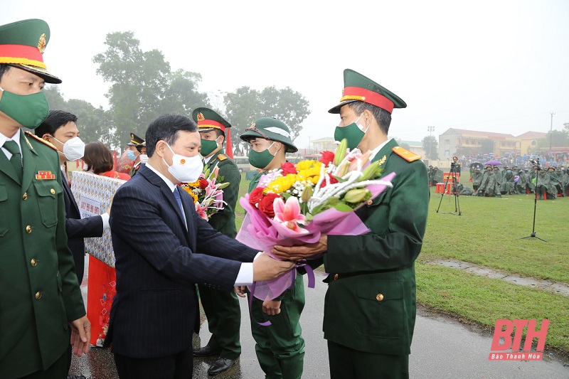 Sau các nghi thức của buổi lễ giao nhận quân, đồng chí Phó Bí thư Thường trực Tỉnh ủy Lại Thế Nguyên và lãnh đạo huyện Thiệu Hóa đã tặng hoa động viên các chiến sỹ mới yên tâm lên đường nhập ngũ.