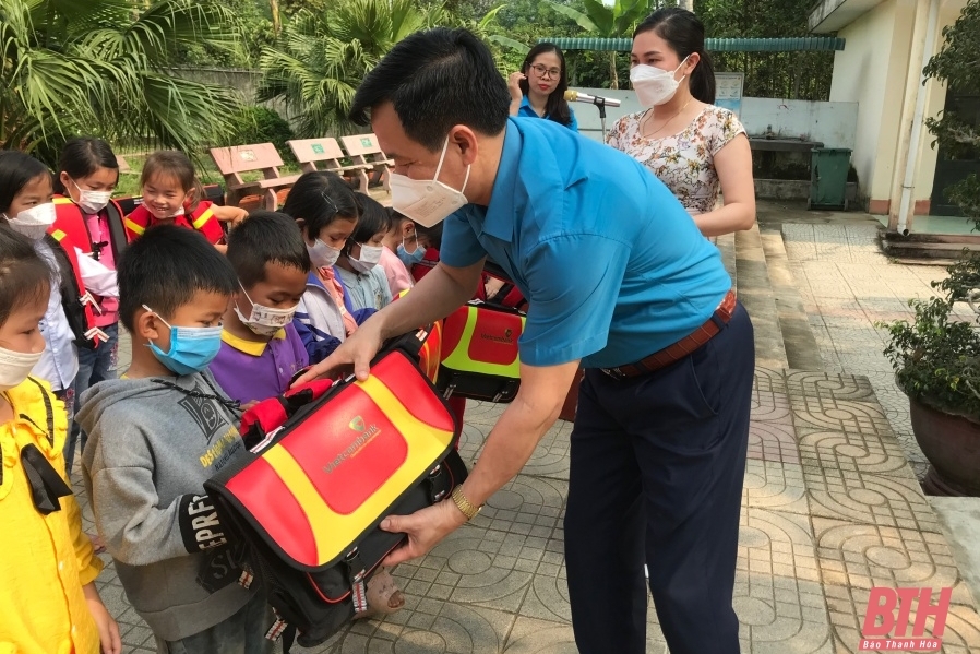 Phó Chủ tịch LĐLĐ tỉnh Mai Bá Nam trao cặp phao cứu sinh cho học sinh có hoàn cảnh khó khăn Trường tiểu học Luận Khê 2, huyện Thường Xuân.