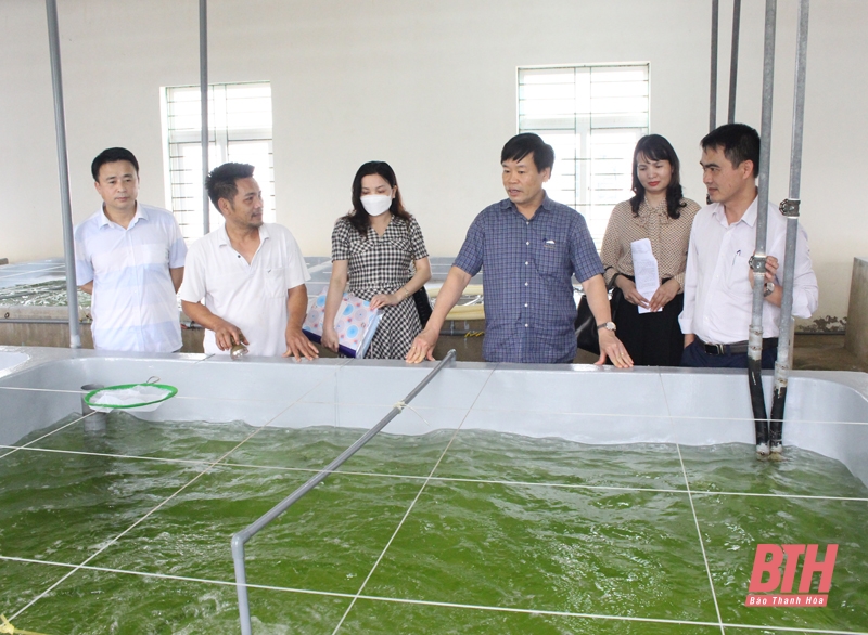 Đồng chí Nguyễn Ngọc Túy, Giám đốc Sở Khoa học và Công nghệ (người thứ 4 từ trái qua) kiểm tra mô hình nuôi ngao thương phẩm thử nghiệm tại xã Hoằng Thanh (Hoằng Hóa). Ảnh: Trường Giang