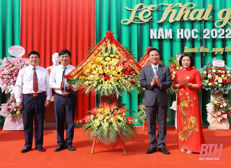 Thay mặt Tỉnh ủy, HĐND, UBND, Ủy ban MTTQ tỉnh Thanh Hóa, đồng chí Bí thư Tỉnh ủy Đỗ Trọng Hưng tặng thầy và trò Trường THPT chuyên Lam Sơn lẵng hoa chúc mừng năm học mới.