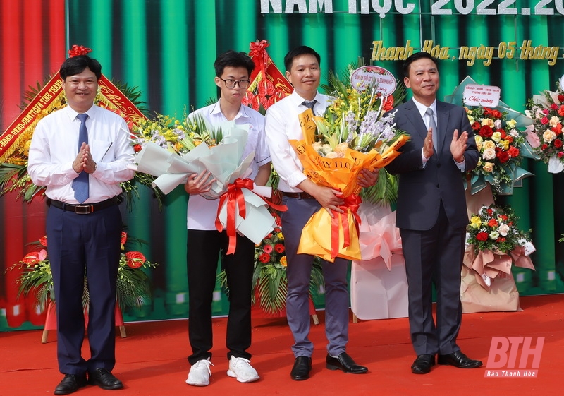 Đồng chí Bí thư Tỉnh ủy Đỗ Trọng Hưng và lãnh đạo Trường THPT chuyên Lam Sơn tặng hoa và khen thưởng thầy và trò đã giành huy chương bạc trong kì thi Olympic Toán học Quốc tế lần thứ 63.