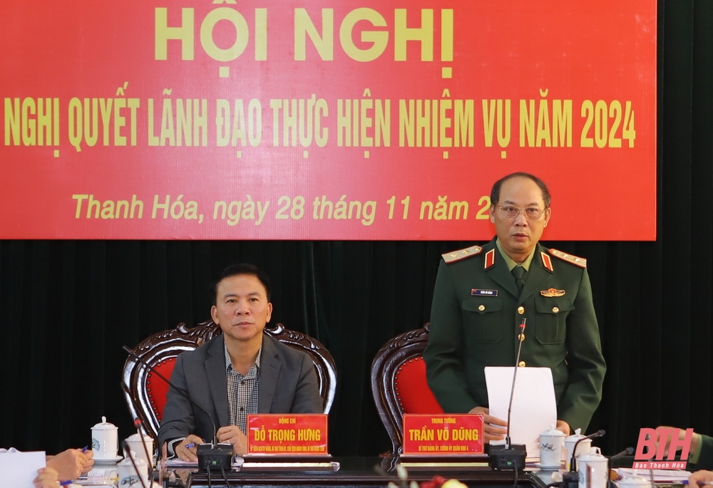 Phát biểu chỉ đạo tại hội nghị, Trung tướng Trần Võ Dũng, Bí thư Đảng ủy, Chính ủy Bộ Tư lệnh Quân khu 4 ghi nhận, biểu dương và chúc mừng những kết quả mà tỉnh Thanh Hóa đạt được trong năm 2023. Đồng thời phân tích, làm rõ thêm về tình hình quốc tế, khu vực và trong nước tác động đến công tác QS,QP và cảm ơn Tỉnh ủy, HĐND, UBND tỉnh Thanh Hóa đã luôn quan tâm đến công tác xây dựng LLVT tỉnh vững mạnh về mọi mặt, có nhiều đóng góp vào những kết quả chung của Quân khu.