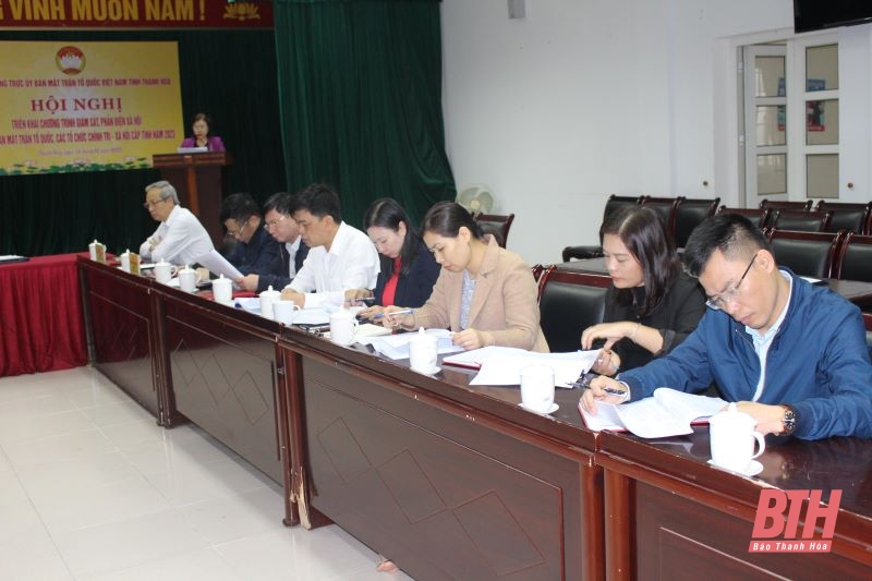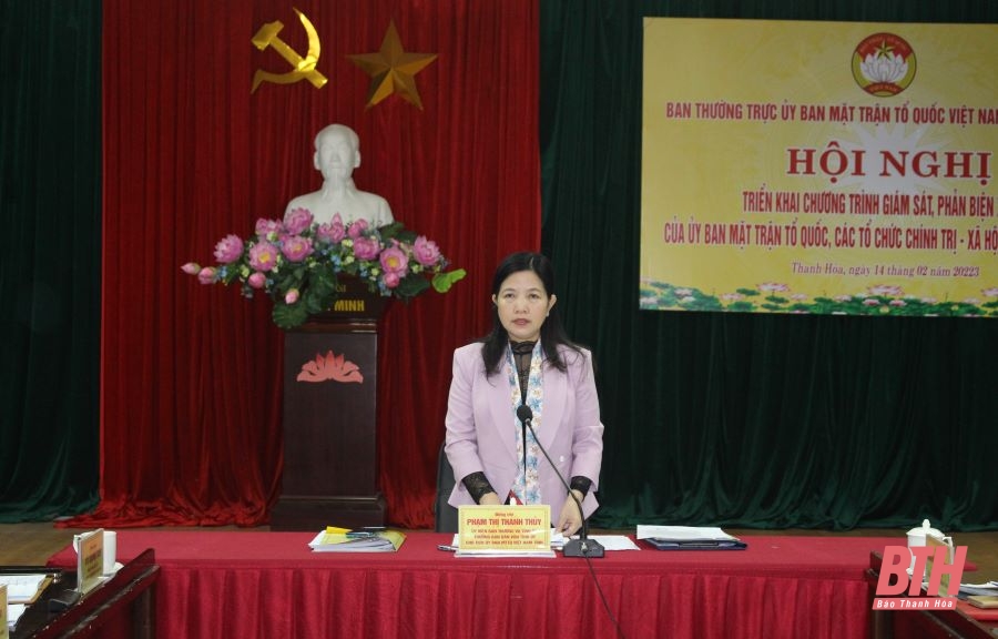 Sáng 14 - 2, Ban Thường trực Ủy ban MTTQ tỉnh Thanh Hóa tổ chức hội nghị triển khai chương trình giám sát, phản biện xã hội của Ủy ban MTTQ và các đoàn thể chính trị - xã hội cấp tỉnh năm 2023. Đồng chí Phạm Thị Thanh Thủy, Ủy viên Ban Thường vụ, Trưởng Ban Dân vận Tỉnh ủy, Chủ tịch Ủy ban MTTQ tỉnh chủ trì hội nghị.