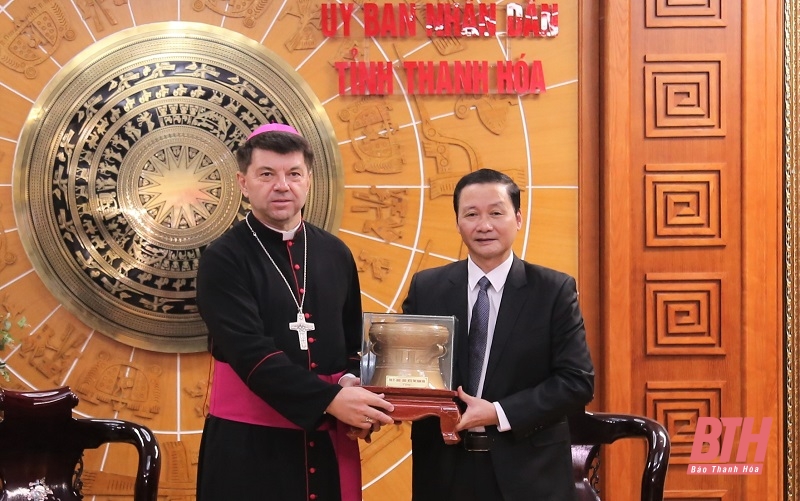 Đức Tổng Giám mục Marek Zalewski tặng quà lưu niệm lãnh đạo tỉnh Thanh Hóa.
