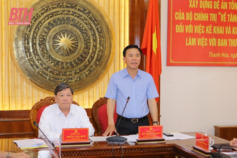 Phát biểu tại buổi làm việc, Bí thư Tỉnh ủy Đỗ Trọng Hưng khẳng định nhận thức sâu sắc của cấp ủy, tổ chức đảng, chính quyền và các cơ quan trong tỉnh về ý nghĩa, tầm quan trọng của Chỉ thị 33; đồng thời thông tin, làm rõ thêm một số kết quả nổi bật, cũng như những khó khăn, hạn chế trong quá trình thực hiện Chỉ thị 33 tại Thanh Hóa. Về vấn đề xác minh tài sản, thu nhập, đồng chí Bí thư Tỉnh ủy cho rằng: Nếu làm tốt công khai, minh bạch thì việc xác minh sẽ thuận lợi và chính xác hơn, phát huy được vai trò giám sát của cán bộ, đảng viên và quần chúng Nhân dân đối với công tác này. Đồng chí Bí thư Tỉnh ủy thống nhất đề nghị Bộ Chính trị ban hành Chỉ thị mới về kê khai và kiểm soát việc kê khai tài sản trong giai đoạn mới; trên cơ sở đó đề nghị Ban Bí thư ban hành quy định nhằm thể chế hóa Chỉ thị để thuận lợi trong triển khai thực hiện, khắc phục được những khó khăn, vướng mắc và bất cập như trong thời gian qua.