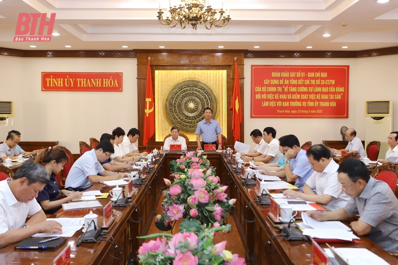 Chiều 23-5, dưới sự chủ trì của đồng chí Trần Văn Rón, Ủy viên Trung ương Đảng, Phó Chủ nhiệm Thường trực Ủy ban Kiểm tra Trung ương và đồng chí Đỗ Trọng Hưng, Ủy viên Trung ương Đảng, Bí thư Tỉnh ủy, Chủ tịch HĐND tỉnh, Đoàn khảo sát số 1 - Ban Chỉ đạo xây dựng Đề án Tổng kết Chỉ thị số 33-CT/TW của Bộ Chính trị “Về tăng cường sự lãnh đạo của Đảng đối với việc kê khai và kiểm soát việc kê khai tài sản” (gọi tắt là Chỉ thị 33- PV) đã có buổi làm việc với Ban Thường vụ Tỉnh ủy Thanh Hóa.