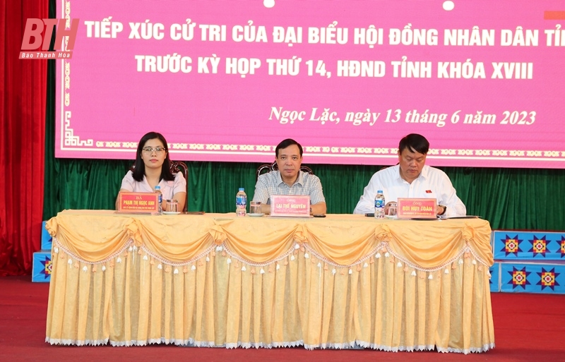 Sáng 13-6, Tổ đại biểu HĐND tỉnh gồm các đại biểu: Lại Thế Nguyên, Phó Bí thư Thường trực Tỉnh ủy, Trưởng đoàn ĐBQH tỉnh; Bùi Huy Toàn, Phó Bí thư Huyện ủy, Chủ tịch UBND huyện Ngọc Lặc; Phạm Thị Ngọc Anh, bác sĩ Bệnh viện Đa khoa khu vực Ngọc Lặc, đã có buổi tiếp xúc cử tri huyện Ngọc Lặc trước kỳ họp thứ 14, HĐND tỉnh khóa XVIII.