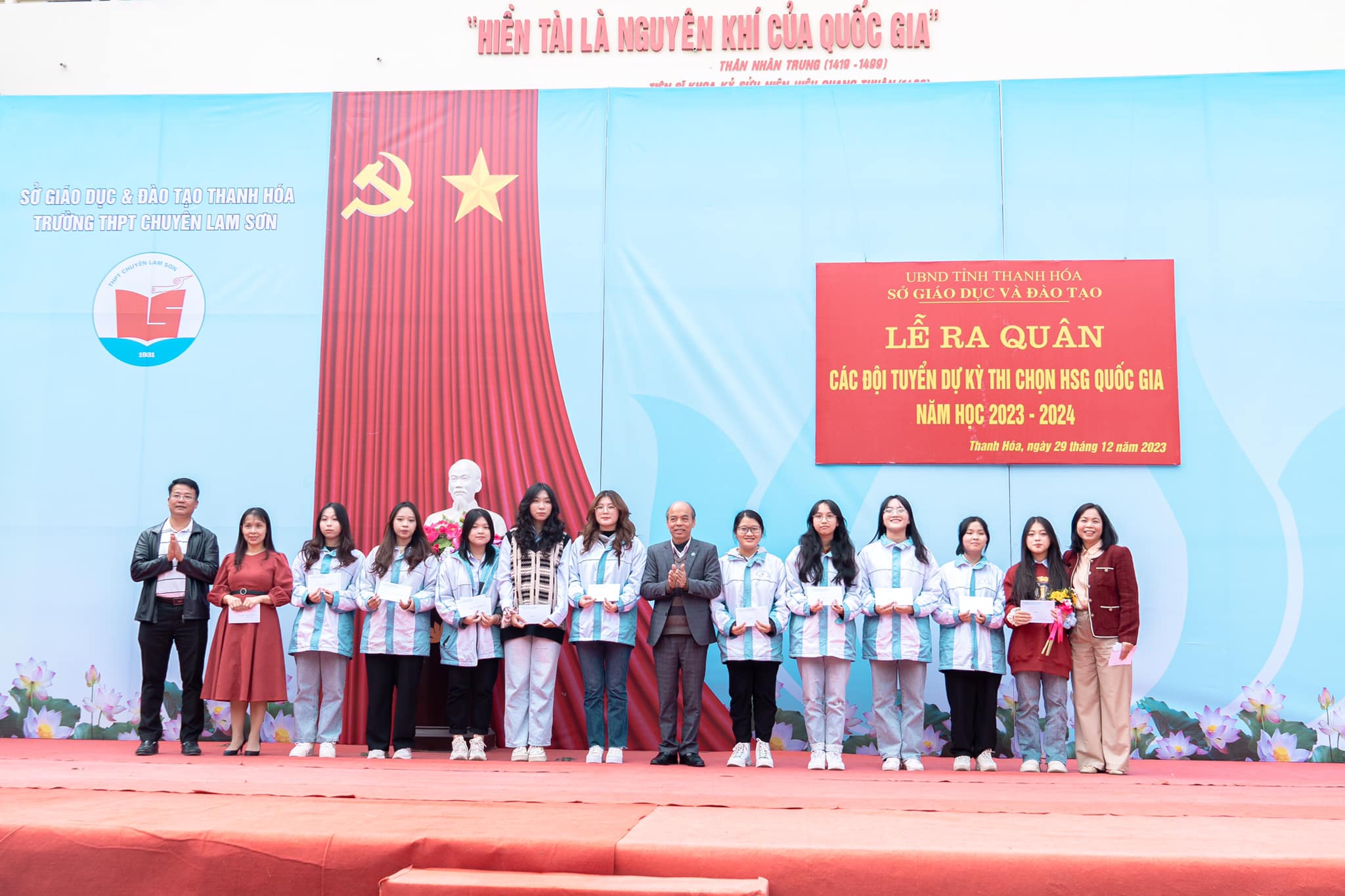 Đại diện lãnh đạo Sở Giáo dục và Đào tạo Thanh Hóa trao quà cho các em học sinh tại Lễ ra quân các đội tuyển dự thi chọ học sinh giỏi Quốc gia năm học 2023-2024.
